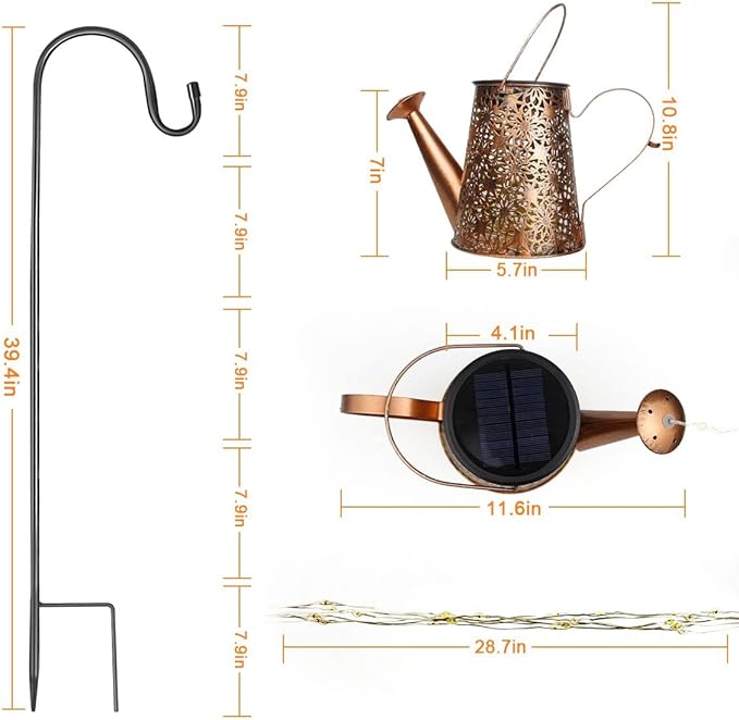 - Waterproof IP65:Solar watering can use high-quality metal material, waterproof and rust-proof, Not easy to break. LED string lights and solar panels are IP65 waterproof, you don't have to worry about damage in rainy days.
