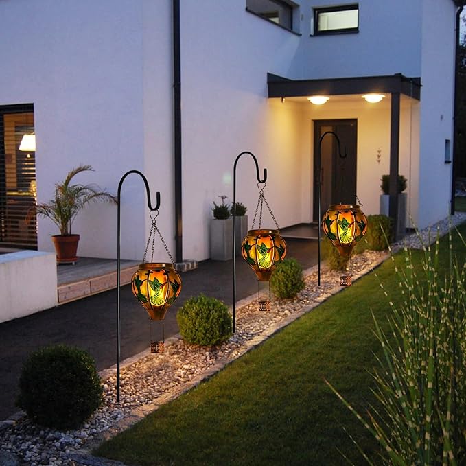 - 【Unique Hot Air Balloon Design】--This hanging solar light is composed of 8 pieces of hummingbird glass with lifelike flame lights. As night falls, their glow adds warmth and comfort to your garden, patio, yard, path, and more, great Christmas decorative lights.