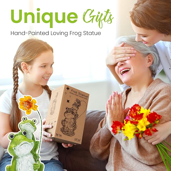- Unique Design: This garden sculpture celebrates the mother-child connection through a mother frog holding a flower stem with her baby on her back, topped by a blooming flower. By day, it's a lovely display; by night, the solar-powered flower illuminates