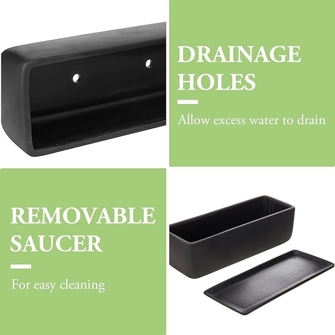 - Modern window box style rectangular 10 inch long matte black ceramic planter with removable drip tray, perfect size for your windowsill, display shelf, or desktop