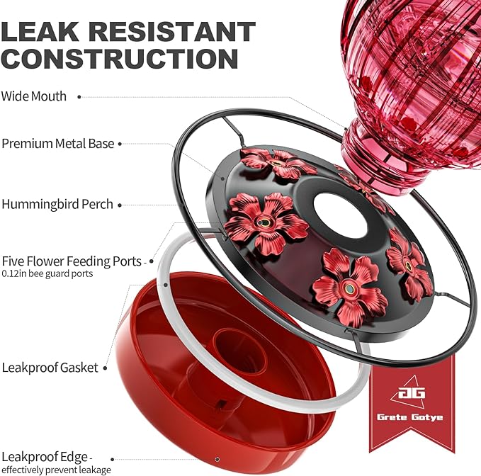 - đ§LEAKPROOF FUNCTION: Built-in durable gasket, unique design makes base connection proper and seamless, even when the hummingbird feeders for outdoors hanging are shaken by wind or birds perching on it. After filling the container and screwing it onto the base, flip it over and hang it on a tree/deck hook/shepherd's hook/hangers/window hook.