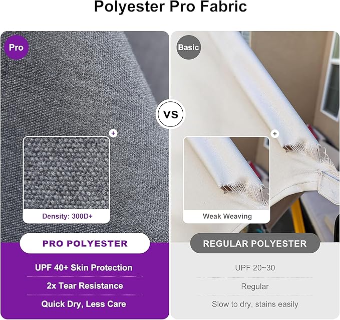 - Premium Polyester Pro Canopy - Features 2X tear-resistant fabric with 3 years fade resistance, quick-drying and easy to clean. Withstands sun, rain and wind while resisting wrinkles and shrinkage for lasting durability.