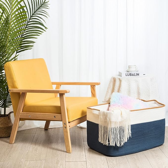 MINTWOOD Design 22in Extra Large Blanket Basket Holder Living Room, Rectangle Rope Woven Storage Basket with Handles for Laundry, Pool Towels, and Shoes, Dog Toy Organizer Bin Box, Prussian Blue