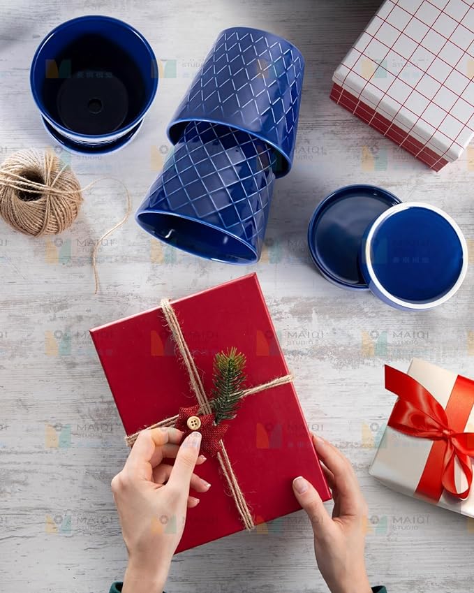Ceramic Plant Pots –5 inch Indoor Flower Pot with Drainage Hole and Ceramic Tray - Gardening Home Desktop Office Windowsill Decoration Gift, Set of 4-Plants NOT Included(Blue)