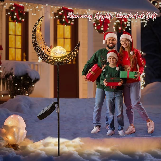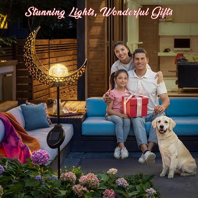 - The crescent moon solar garden stakes design with Warm White 8 Lumens LED, emit stunning glow. The reflection of the pattern is beautiful enough to create a romantic and festive atmosphere in your front porch, back yard,lawn,flower bed or garden.