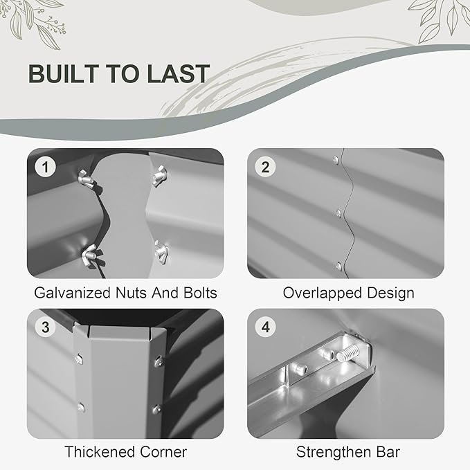 - Thicker Material: Made of thick galvanized steel plate with eco-friendly coating, rust-proof and durable. The 0.8 mm thickness, reaching 1.8 mm in the thickest part, ensures long-lasting raised garden beds' outdoor aesthetics.