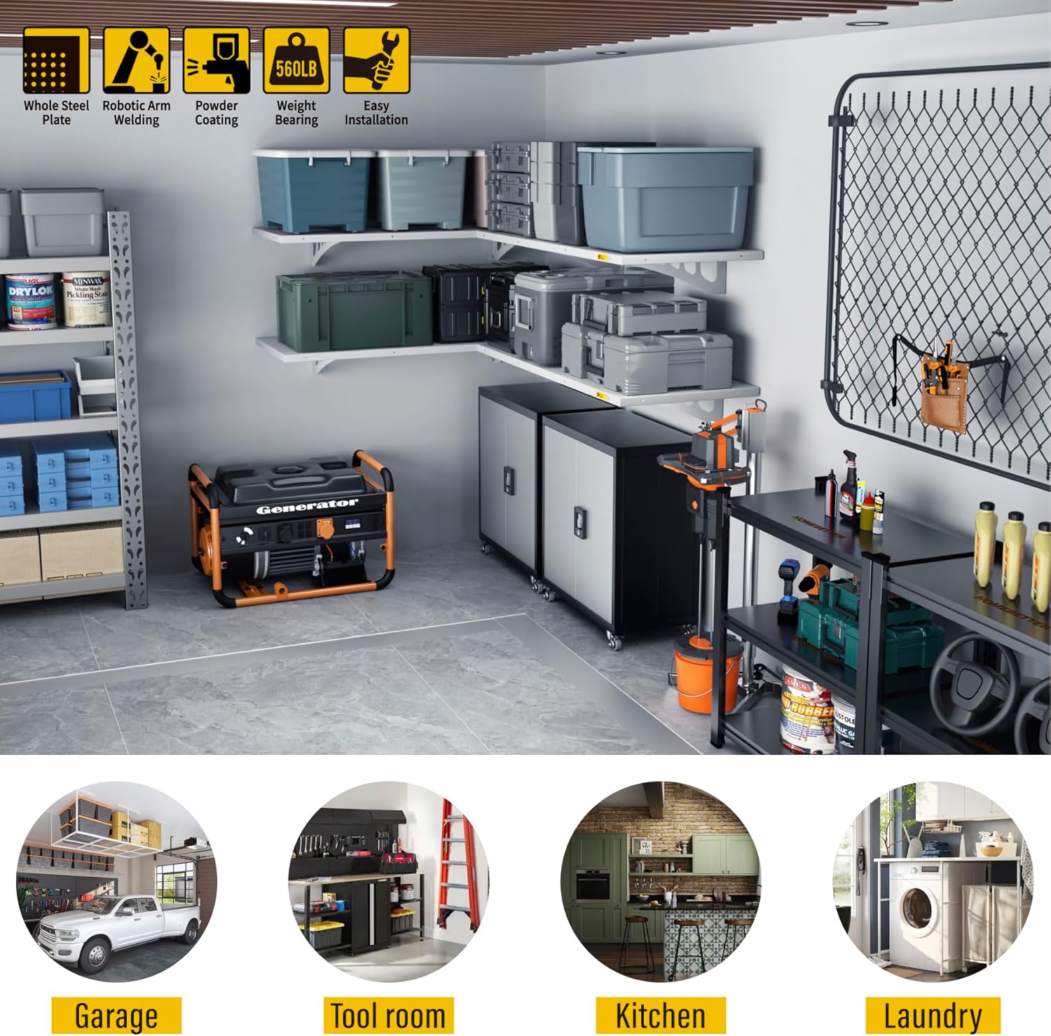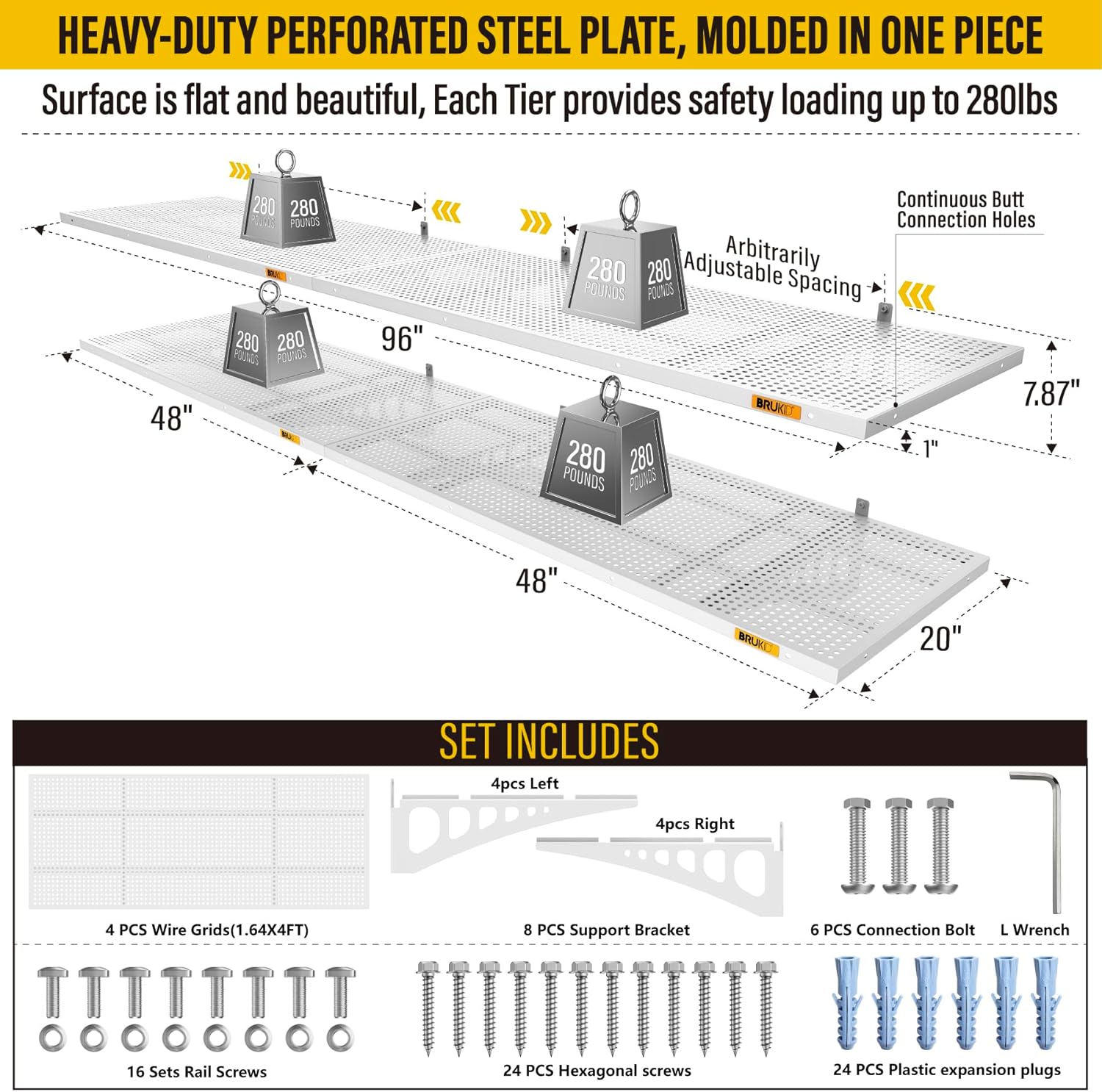 - SUPERIOR DESIGN: Wall shelf garage storage rack panel is made of whole piece of perforated steel plate bending and welding, the surface of matte high temperature powder baking paint, flat and smooth; the panel adopts slide rail design, can be adjusted by parallel left and right sliding at will; bracket can be freely installed in 45” range of the spacing of the wood wall keel, without affecting the precision connection with the panel, eliminating the worry of being unable to docking due to the mismatch of spacing points of load-bearing wood wall keel or inaccuracy of the installation of the bracket. It saves time and labor
