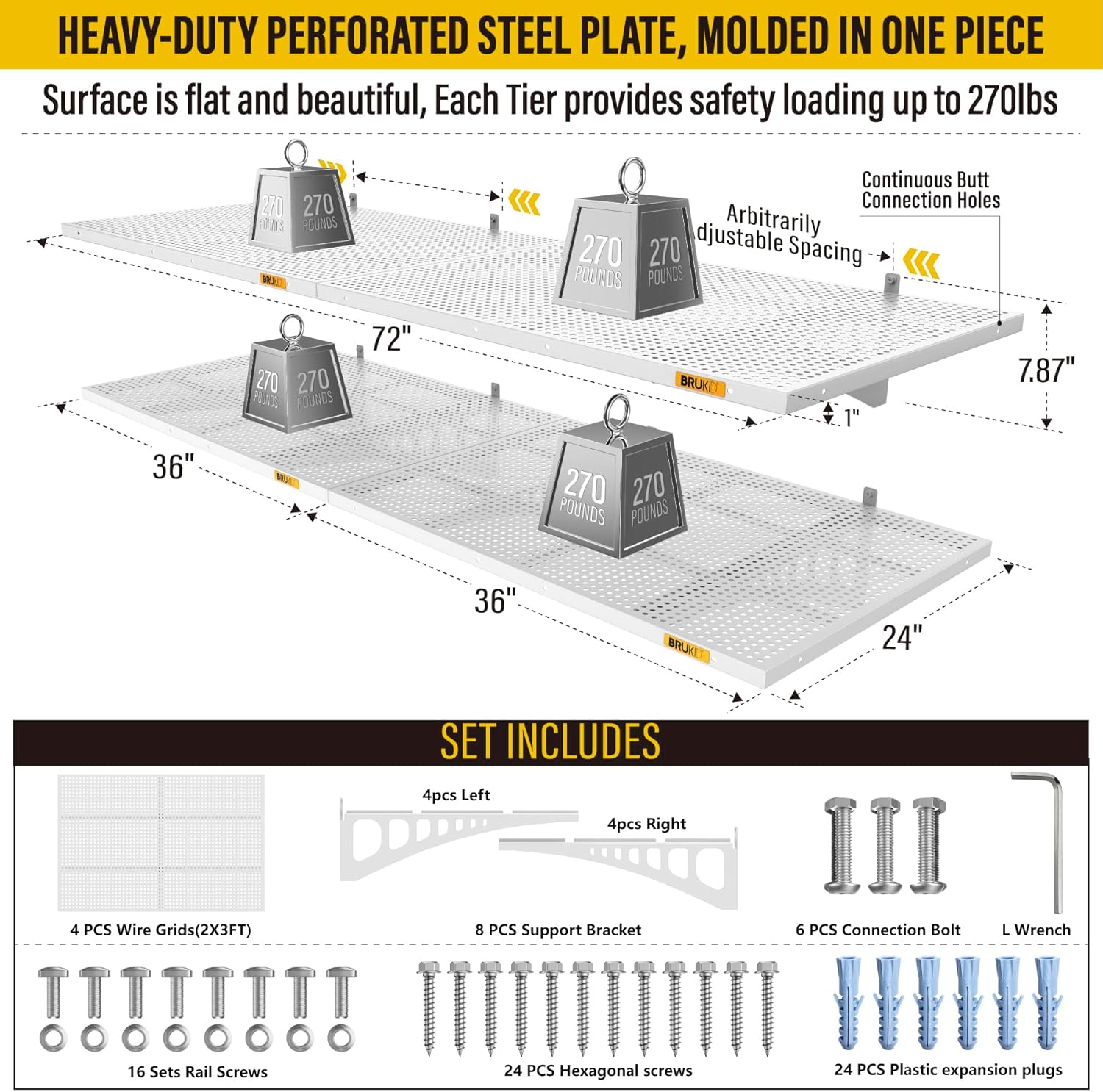 - KIT INCLUDES: Includes 4pcs of face plate; 8 Brackets; 24 Hexagonal screws (Hardened ∅0.2" L/2"); 24 plastic expansion plugs, 16 Sets of rail attachment bolts; 1 L-wrench; 1 installation manual. All the hardware of Brukid professional series wall mounted shelves are under strict quality control and testing, we strive to provide our customers with a quality shopping experience, when you receive the product encountered any problems, please contact us at the first time, we will certainly give you a satisfactory solution
