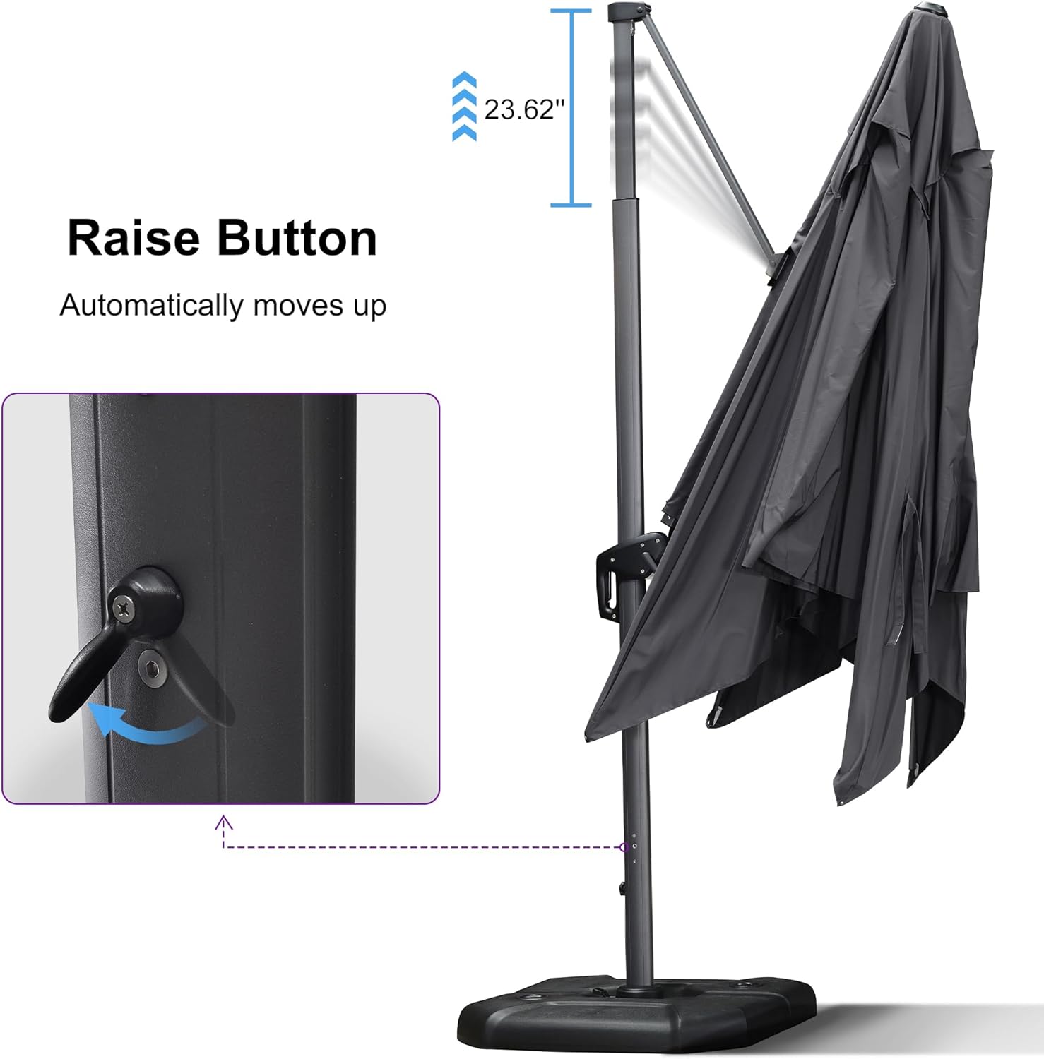 - Five-level Adjustment & 360° Rotation: The crank system of this cantilever umbrella makes it easy to raise and lower the canopy, the unique handle design also makes tilting the patio umbrella effortless, foot pedal allows for complete 360 degree rotation