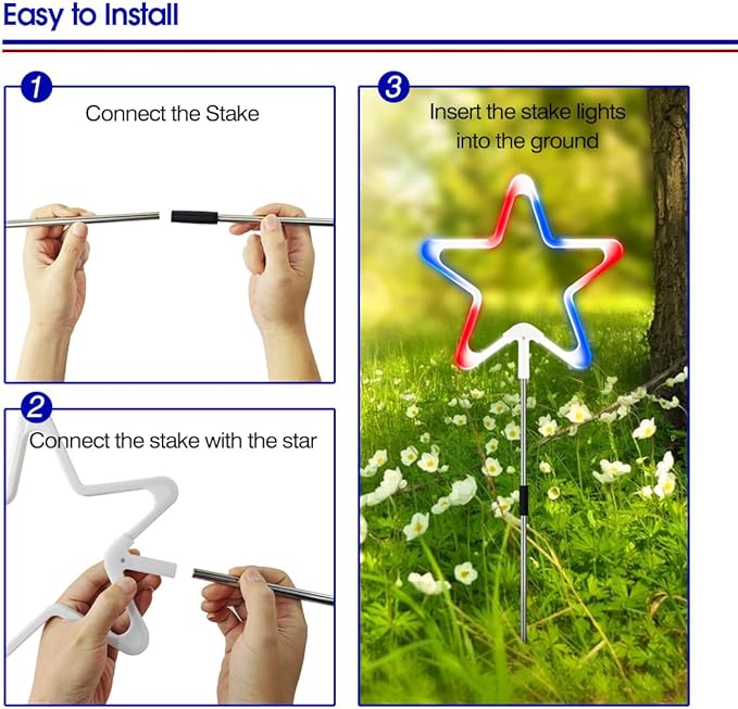 - Easy to Install: This Fourth of July stake light is very easy to install. Just insert the stake into the ground, and then electricity, you can enjoy the red, white and blue lights like the American flag, creating an patriotic atmosphere for your gathering and fully showing patriotism