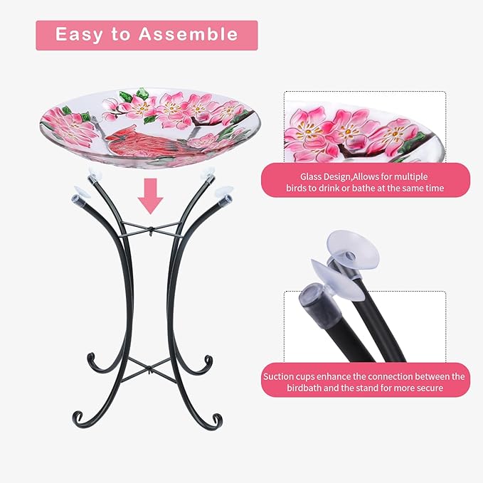 VCUTEKA Bird Baths for Outdoors, Glass Bird Bath with Metal Standing for Garden, Yards Patio Décor, Bird Lovers Gift, Cardinal Glass Birdbath Detachable (22" H * 18" W)
