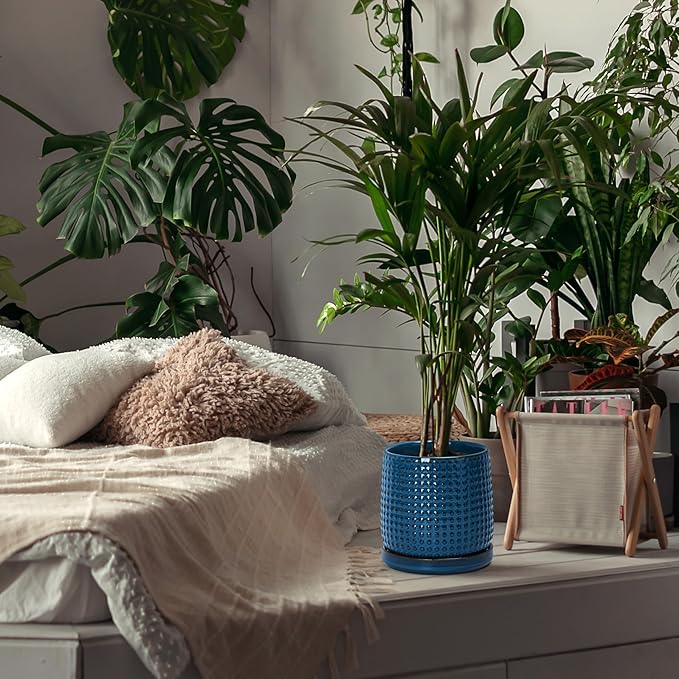 D'vine Dev 6 Inch Ceramic Beaded Stoneware Planter Pot - Flower Pot with Drainage Holes and Saucers for Indoor Succulent Plants or Flowers, Midnight Blue, 27-C-X-3