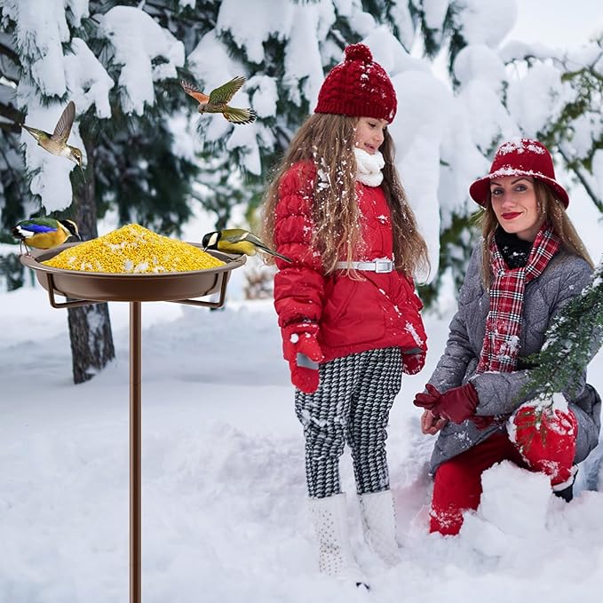 - 【Metal Bird Feeder Stand】 The whole bird bath and the pedestal are made of premium quality metal and and covered with safety coating, long-lasting and sturdy, can resist rain, water, and other weather, withstand strong sunlight and cold temperatures.It is more sturdy, light and not easily broken than a glass bird bath. It is stronger than plastic and resin bird baths, will not fade, will not break, and will not leak.