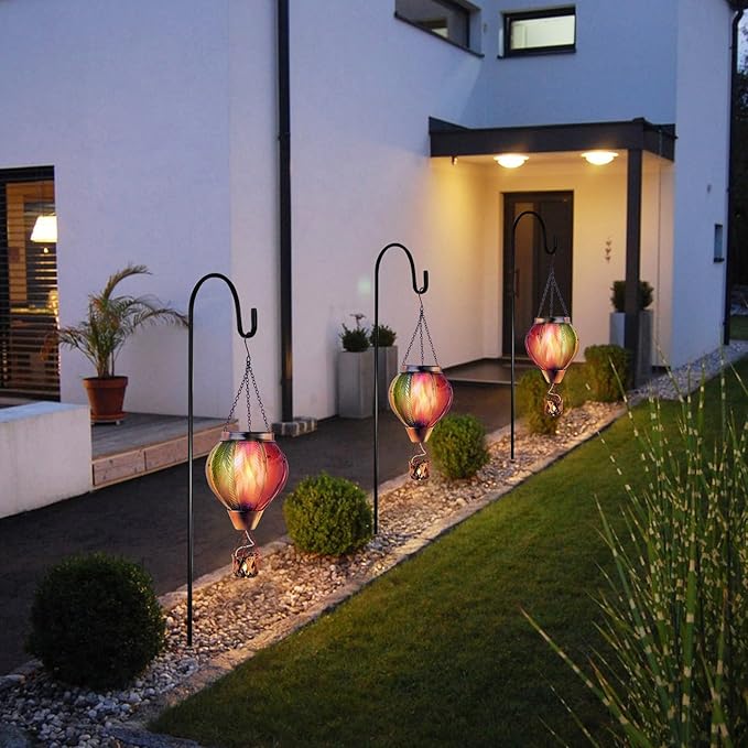 - 【Unique Hot Air Balloon Design】--This hanging solar light is composed of 8 pieces of stained glass with lifelike flame lights. As night falls, their glow adds warmth and comfort to your garden, patio, yard, path, and more, great Christmas decorative lights.