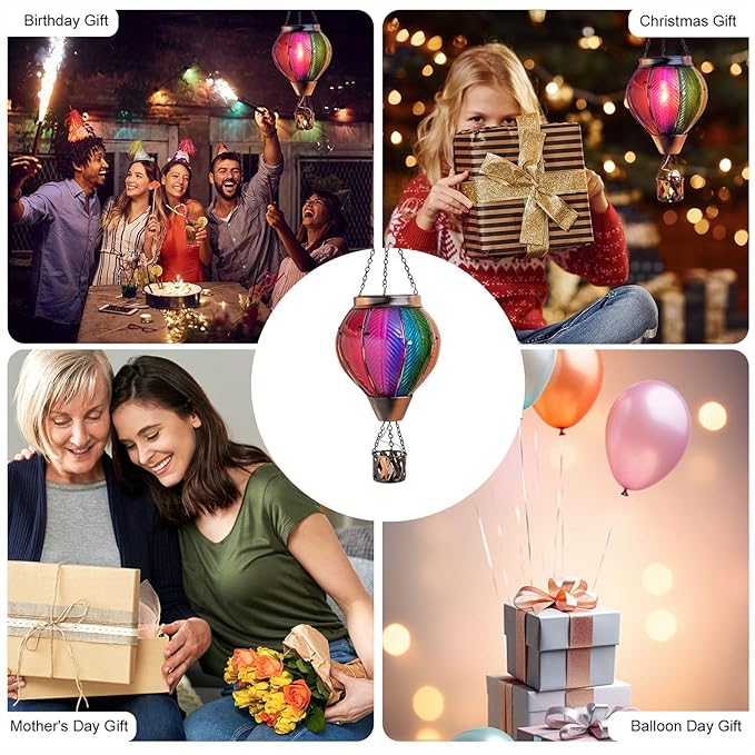 - 【Wide Application】-- Hot air balloon lantern with a chain hook, you can hang the solar light on porches, trees, pergolas, balconies, or ledge. Add elegance and color to your outdoor space with this beautifully crafted solar-powered lantern. Perfect gift for your friends and family.