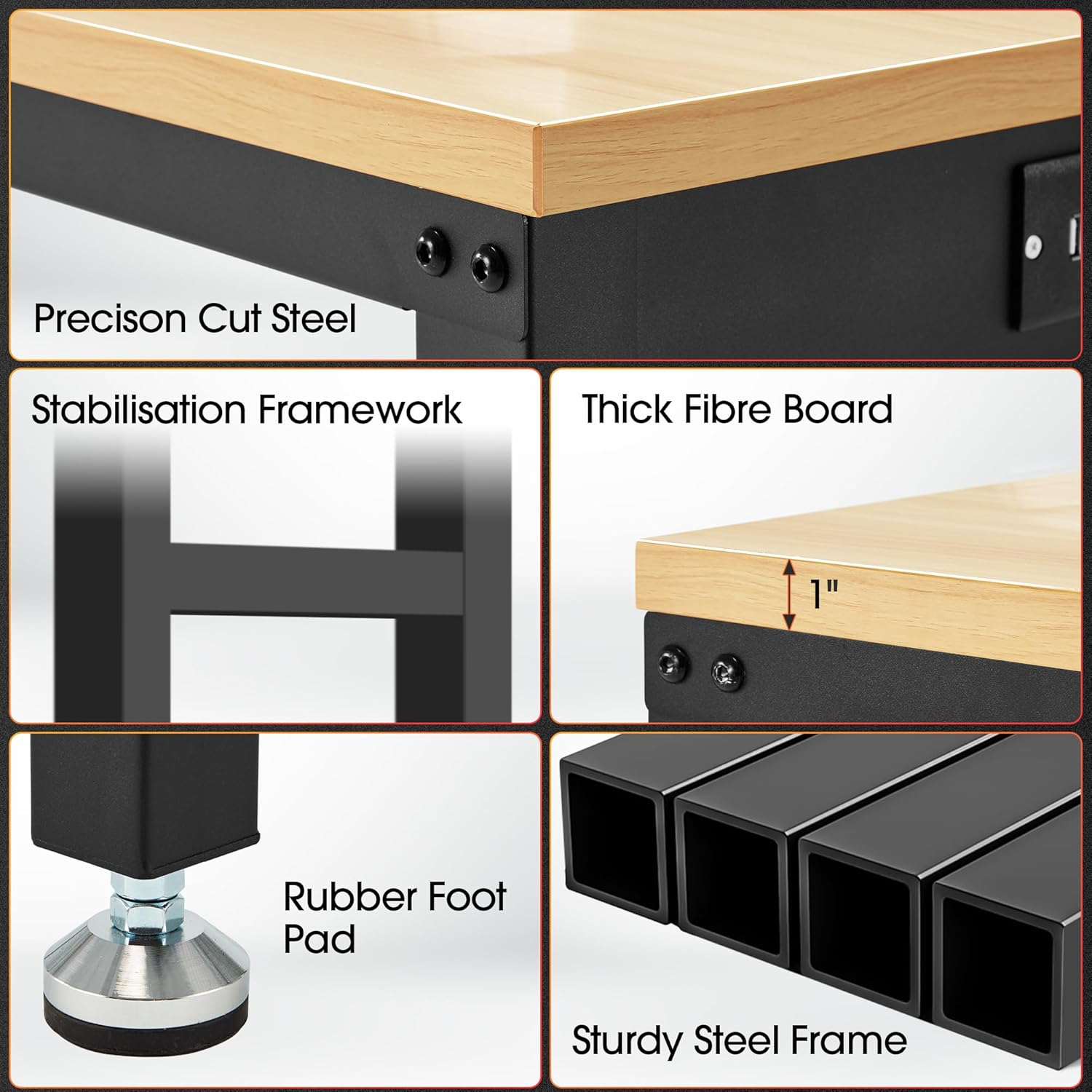 - Heavy Duty Work Bench: Constructed of high quality materials, the workbench consists of a 1" thick wood board tabletop and black textured steel frame that withstands powerful impacts up to 2000 lbs