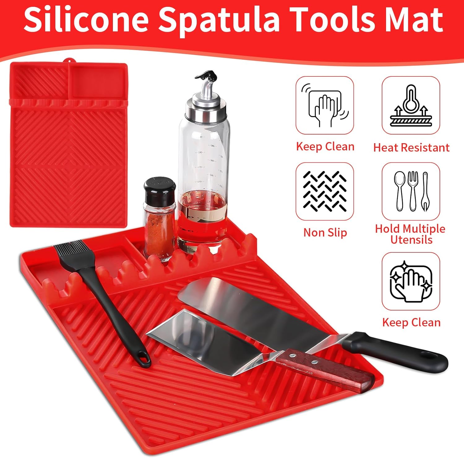 - 【Durability 16x11.5" Silicone Mat】- Elevate your cooking experience with our resilient 16x11.5" silicone spatula mat. Crafted for durability and versatility, it effortlessly transforms your Blackstone side shelf into an organized haven. Use it as a grill BBQ caddy, seasoning jar holder, or ladle spoon organizer, keeping your kitchen, cooking space, and countertop spotless.