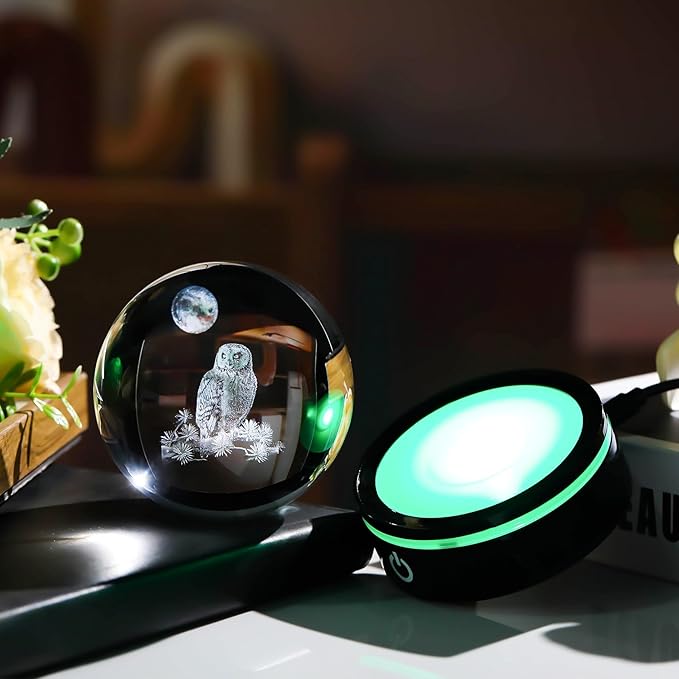 YWHL 3D Owl Figurine Crystal Ball With Colorful Light Base, Gifts for Women Men Lovers on Christmas Birthday, Laser Engraved Sphere Glass Ball for Home Office Decoration (80mm)