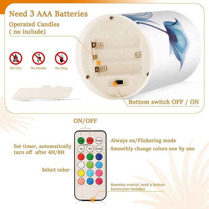 - Convenient Remote Functions: Includes an 18-key remote controller with a timer. You can control these candles remotely when they are placed somewhere difficult to touch. Set 4H/8H timers will save you trouble turning them on/off, they will come back on automatically at the same time every day. Also, you can adjust the light color as you want