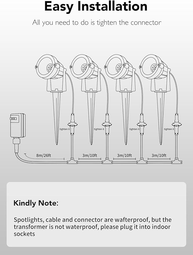 - 4-in-1 Low Voltage Landscape Lighting Kit: This landscape lighting kit includes 4x 6W outdoor spotlights, 1x 36W FCC-Certificated transformer with long cable. The total length of the cable is 17m/56ft (the length between the transformer and the first light is 8m/26ft, the length beetween the light and light is 3m/10ft). All you have to do is conncet the each light to the main cable which is very easy to use.
