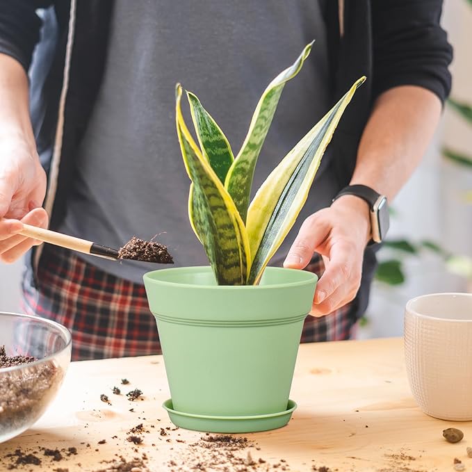 6 inch Plastic Nursery Pots, Seedling Pots, 16 Pack Plant Pots for Small Indoor Outdoor Plants, Flower Pots with Drainage Holes and Saucers, Decorative Planters for House Plants, Green