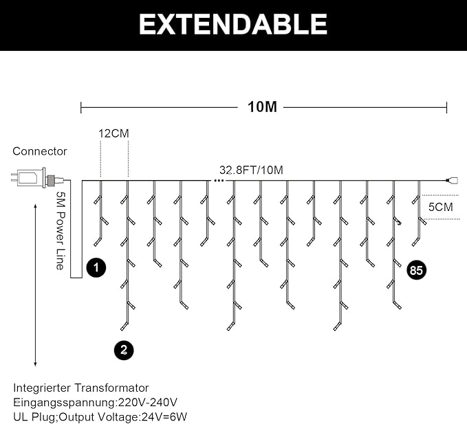 - 【UL Certification & IP65 Waterproof】Christmas icicle lights outdoor are made of high-quality LEDs and strings. It has UL certification and is safe for use. Moreover, it is IP65 waterproof so it can withstand rainy and snowy weather. Our icicle lights are perfect for indoor & outdoor use.