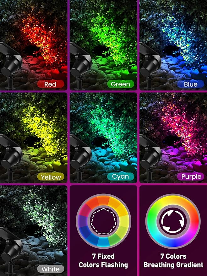 • 🏅【Multiple Colored Solar Landscape Lights Outdoor】ALUSSO LIGHTING color changing outdoor solar spot lights offer 7 colors and 3 unique lighting modes, including fixed, flashing and breathing gradients, for a customized lighting experience in your courtyard.
