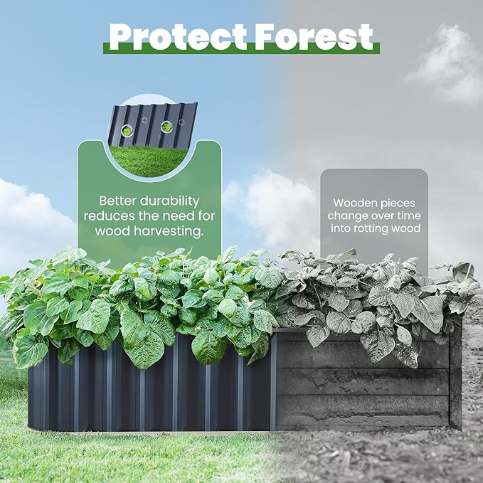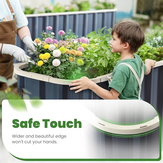 - 【No Sharp Corners & Contrasting Colors】Experience the perfect blend of safety and style with our raised garden bed, featuring smooth, rounded edges that eliminate sharp corners. The widened top not only enhances safety but also elevates the visual appeal with its contrasting color design. Transform your garden into a vibrant and secure haven.