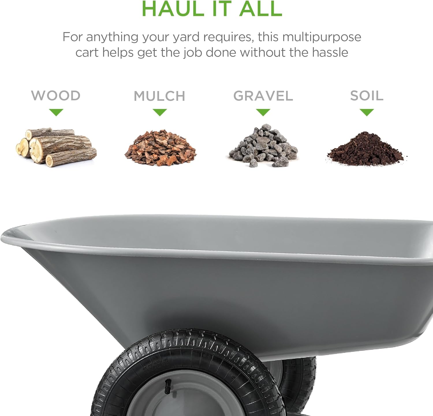 - MULTIPURPOSE GARDEN CART: Deep wheelbarrow holds up to 5 cubic feet of soil, bricks, mulch, gravel, and more, so you can conveniently carry out landscaping and other home improvement projects