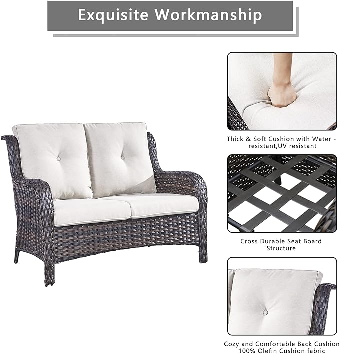 - 【Comfort Cushions & Deep Seating】This patio wicker swivel chairs and loveseat feature deep and wide seats,with 4-inch thick sponge-padded seat cushions,5-inch back cushion create the ultimate patio seating experience.