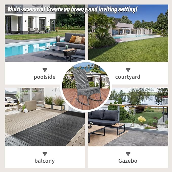 - Quality & Maintain: Delicate composite weaving with half-moon all-weather HDPE wicker material handwoven over fully-welded powder-coated steel framing makes the outdoor rocking chair 3 Pcs durable and sturdy. Breathable 250G polyester anti-UV and water-repellent fabric. Each piece is designed to withstand sunshine beating down and rainstorms rolling through.