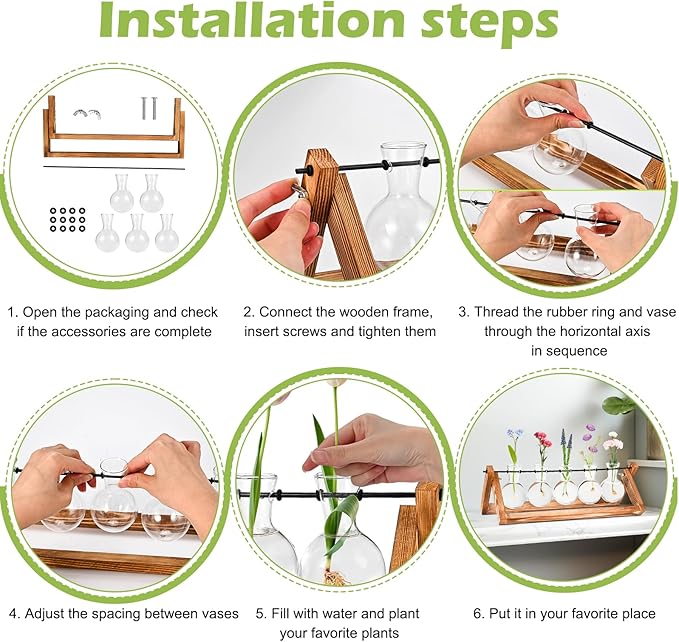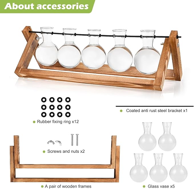 - 3. Minimalist design: Combining natural retro-colored wooden frames with 5 transparent glass bottles, this versatile planter is perfect for showcasing artificial or freshly cut flowers, bouquets, and aquatic plants.