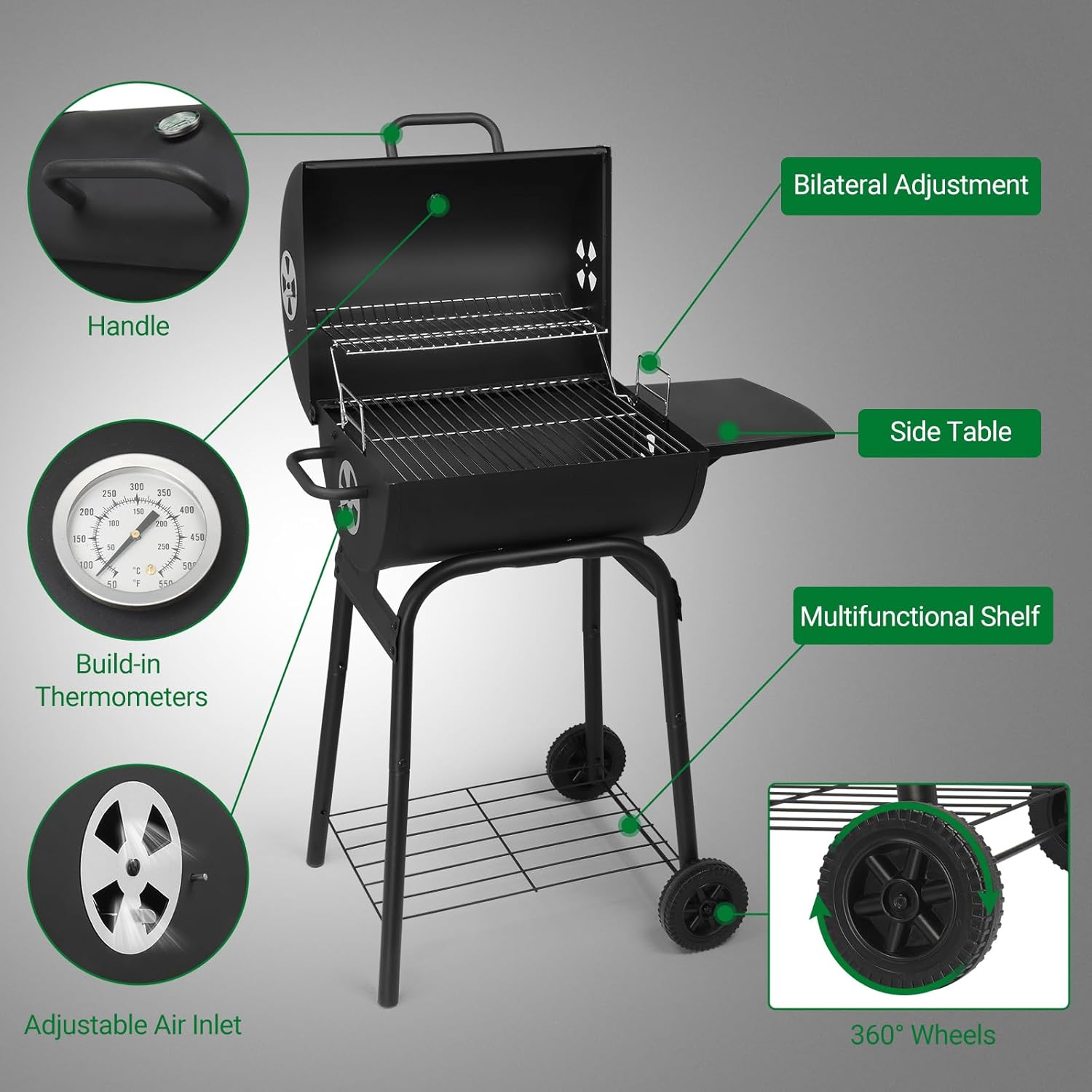 - Easy to Move: Equipped with two durable wheels and a side handle, this grill smoker is easy to move around your backyard, patio, or garden, ideal for outdoor picnics