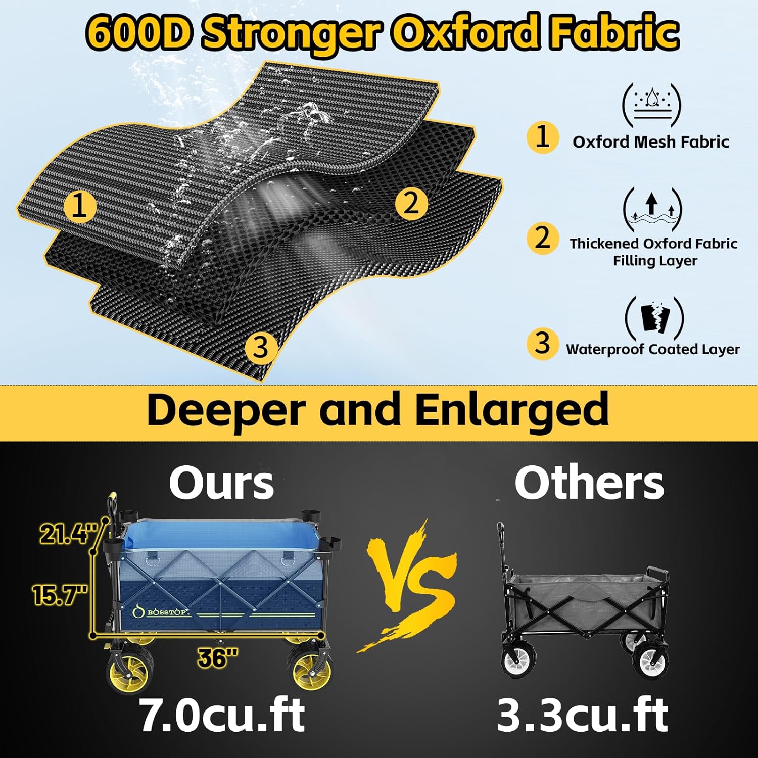 - 【Lasted Firm Frame Structure&Stronger 600D Oxford Fabric】 : This wagon cart uses the thicker antioxidant galvanized stainless steel frame and more stable triangular support structure( thicker 20%),which strengthens overall load-carring capacity and never lose their shape.In order to Increase garden cart’s flexibility and practicability,the new design- two thick Oxford strips are used to fix and support the whole frame.Besides stronger and waterproof 600D Oxford fabric is not easily torn apart