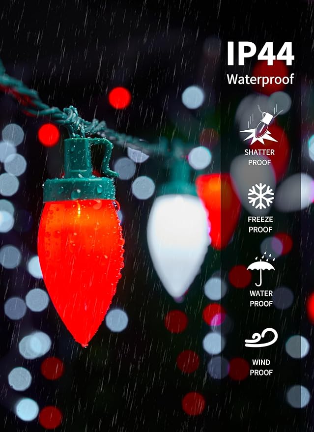 - 【 Outdoor Rated Smooth Opaque Bulbs 】 - These light strings are equipped with large smooth opaque C9 bulbs, producing amazingly saturated color from base to tip for the vintage classic holiday bulb look. Built-in SMD LED creates vivid lighting effects. The bulbs, with their vibrant colors, are designed to resist fading, chipping, and cracking