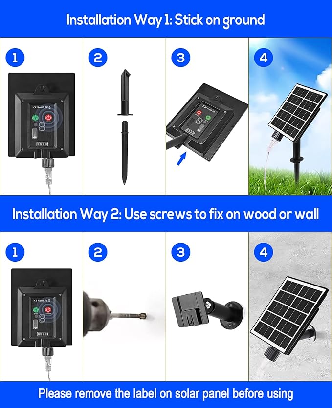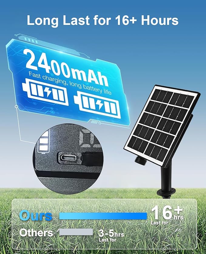 - Easy Operation: The solar panel collects sunlight throughout the day, automatically activating the solar lights at dusk and deactivating them at dawn, ensuring easy operation and energy efficiency. feature a rechargeable 1XAA 1.2V 2400mAh Ni-MH battery, it can be charged with type C cable in rainy and cloudy days