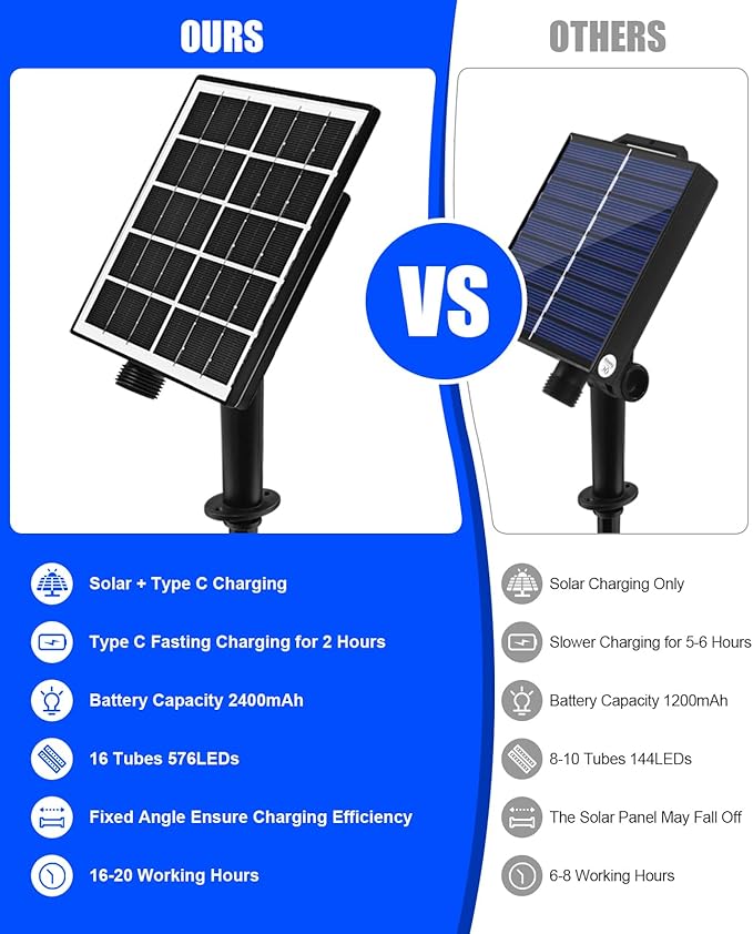 - Energy-Saving & High Efficiency: The meteor shower lights are powered by solar energy, eliminating the need for additional utility costs and battery replacements. With a full charge achieved under 6-8 hours of direct sunlight, the single color solar meteor lights can provide illumination for up to 16-20 hours at night, and multi-color solar meteor lights can work up to 8-10 hours