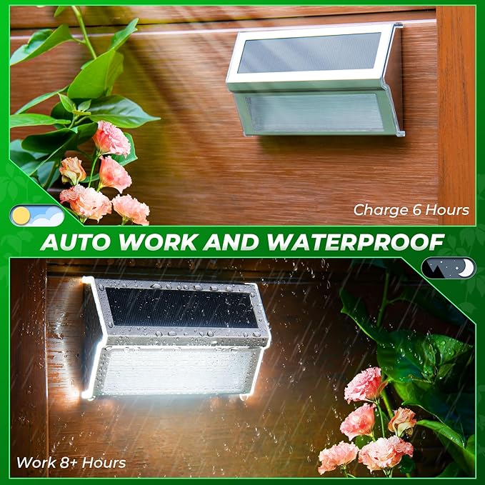 - High Efficiency-Durable Use: The solar deck light panel is made of high-quality monocrystalline silicon, conversion up to 18%, and long-lasting support to light up till dawn.3 LED beads are not too dark and not too bright, light is not too harsh and will not affect your neighbors, and enough for the fence, deck railing, steps, stairs, paths, yard, and garden, making your house brighter and safer, don't worry about strangers approaching.