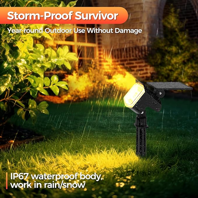 - 【Bright Spotlight - 3000k Warm Light】Solar spot lights outdoor are equipped with 92 LEDs beads, providing brighter and longer-lasting lighting. Solar landscape lights use polycrystalline silicon solar panels with an energy conversion rate of up to 25%, charging efficiency is much higher than similar solar lights. Solar lights suitable for illuminating and decorating your backyard, gardens, lawns, driveways, walkways, trees, flag and sculptures