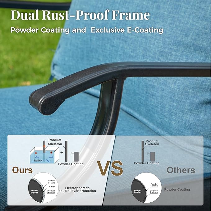 - 【RELIABLE ALL-WEATHER METAL CONSTRUCTION】Built from durable metal with E-COATING and POWDER-COATING finish, ensuring resistance to all weather conditions, rust-proof qualities, and easy maintenance. The sturdy wrought iron frame can withstand various weather conditions, with the single chairs supporting up to 350 lbs and the 3-seater sofa accommodating up to 900 lbs, promising long-lasting reliability and durability.
