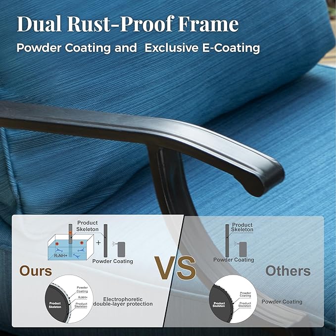 - 【RELIABLE ALL-WEATHER METAL CONSTRUCTION】Built from durable metal with E-COATING and POWDER-COATING finish, ensuring resistance to all weather conditions, rust-proof qualities, and easy maintenance. The sturdy wrought iron frame can withstand various weather conditions, with the single chairs supporting up to 350 lbs and the 3-seater sofa accommodating up to 900 lbs, promising long-lasting reliability and durability.