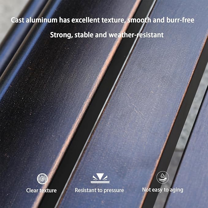 - All weather materials: Made of sturdy cast aluminum with a water-resistant and fade-proof finish. Our patio benches bistro chairs is durability and sunproof, these all-weather features will allow you to use the chairs for a long time