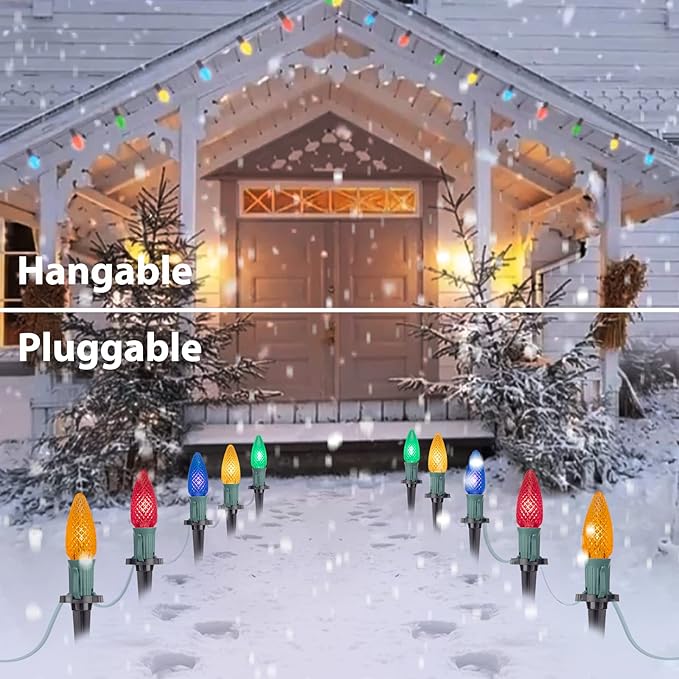 - Hanging or Ground Plugging: Hang up this C9 Christmas stakes lights around your roof line to outline entire house will be amazing, or plug the C9 Christmas lights with stakes alongside the walkway or lane in lawn or garden; These waterproof Christmas outdoor decorations lights for the yard comply with the rain test of UL certification and wonderful decorations for home, patio, garden