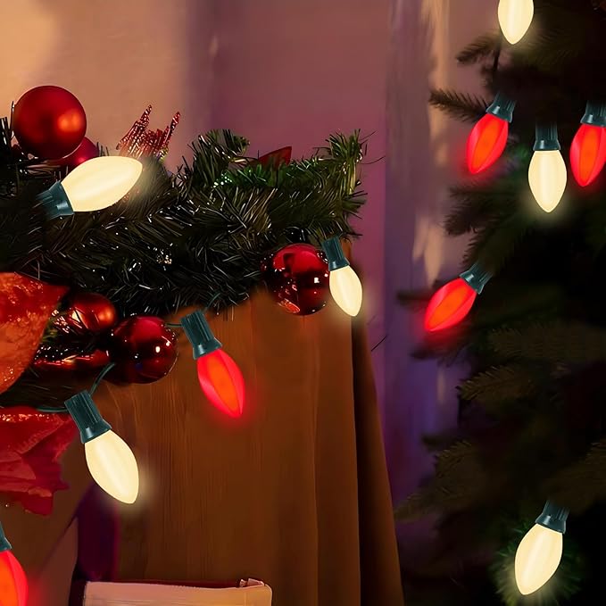 - Energy-Saving LED Bulbs: C7 vintage christmas string lights includes 27 high-quality, energy-efficient red and white bulbs that provide bright, cheerful colors. C7 LED multicolor bulb is 0.6W, LED bulbs use less energy than traditional incandescent bulbs while providing bright and vibrant illumination, helping you save on energy costs during the holiday season. outdoor lights designed to last for years without fading, ensuring your decorations remain vibrant and eye-catching.