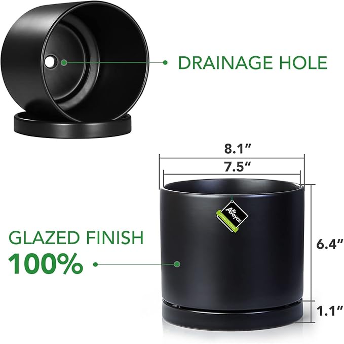 Aveyas 8 inch Ceramic Plant Pot with Drainage Hole and Saucer - Suitable for Indoor and Outdoor Use, Modern Planters for House Garden Flower Tree Snake Monstera Plants (8", Matte Black)