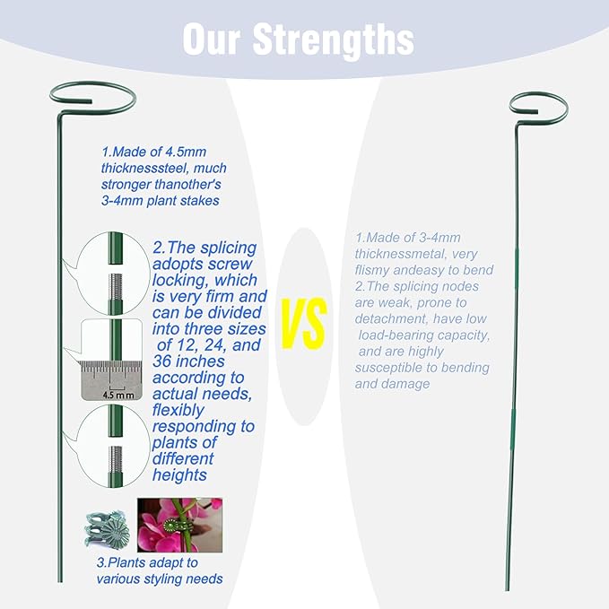 - Upgraded Thickened Plant Support Pole: plant support pole thickened, diameter 4.5 mm, threaded rotary powerful combination, sturdy and durable; carbon steel material, plant support pole surface is treated with anti-rust treatment, rustproof/won't break/split/burn off, provides strong reusable. Smooth and flat surface, won't prick your fingers.