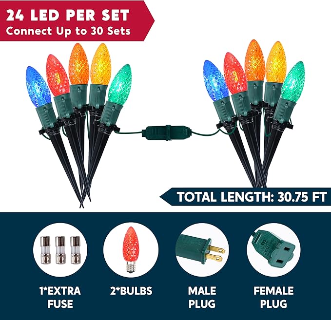 - Ambient Outdoor Lights: 30.75 feet Christmas Strawberry Pathway Stake Lights with 24 LED Walkway Lights Set include 1 Extra Fuse, 2 Spare Bulbs, 1 Male Plug, 1 Female Plug; 15 inch spacing between each C9 Walkway Light bulb, 6 inch tail with female plug and 18 inch head with male connector; Using these Colorful Christmas Yard Lights, which allows 5 colors of red, orange, yellow, green and blue to light up garden, paths, houses, etc., will create an adorable and cozy Christmas festive atmosphere.
