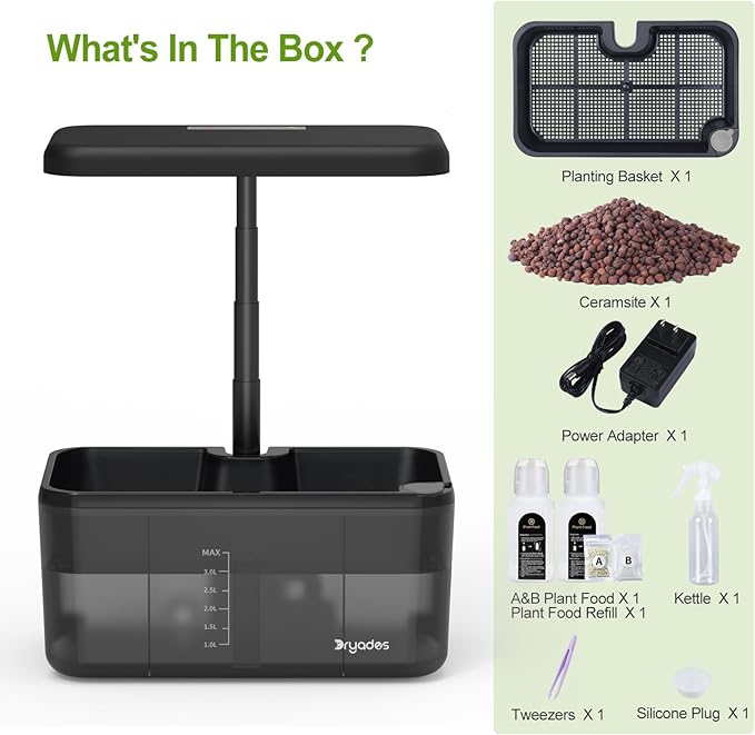 - 【What You Can Get 】Hydroponic Growing System x1(seeds not included), Power Adapter x1, Plant Basket x1, Clay Pebbles x1 Bag, A&B Plant Food x1, Plant Food Refill x1, User Manual x1, Tweezers x1, Silicone Plug x2.