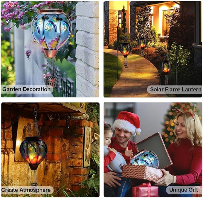 - Solar Hanging Outdoor Lights: hot air balloon solar lights with flame flashing, equipped with high efficiency solar panels and 600mAh/1.2V nickel-metal hydride batteries; Charge 6-8 hours, work 6-8 hours