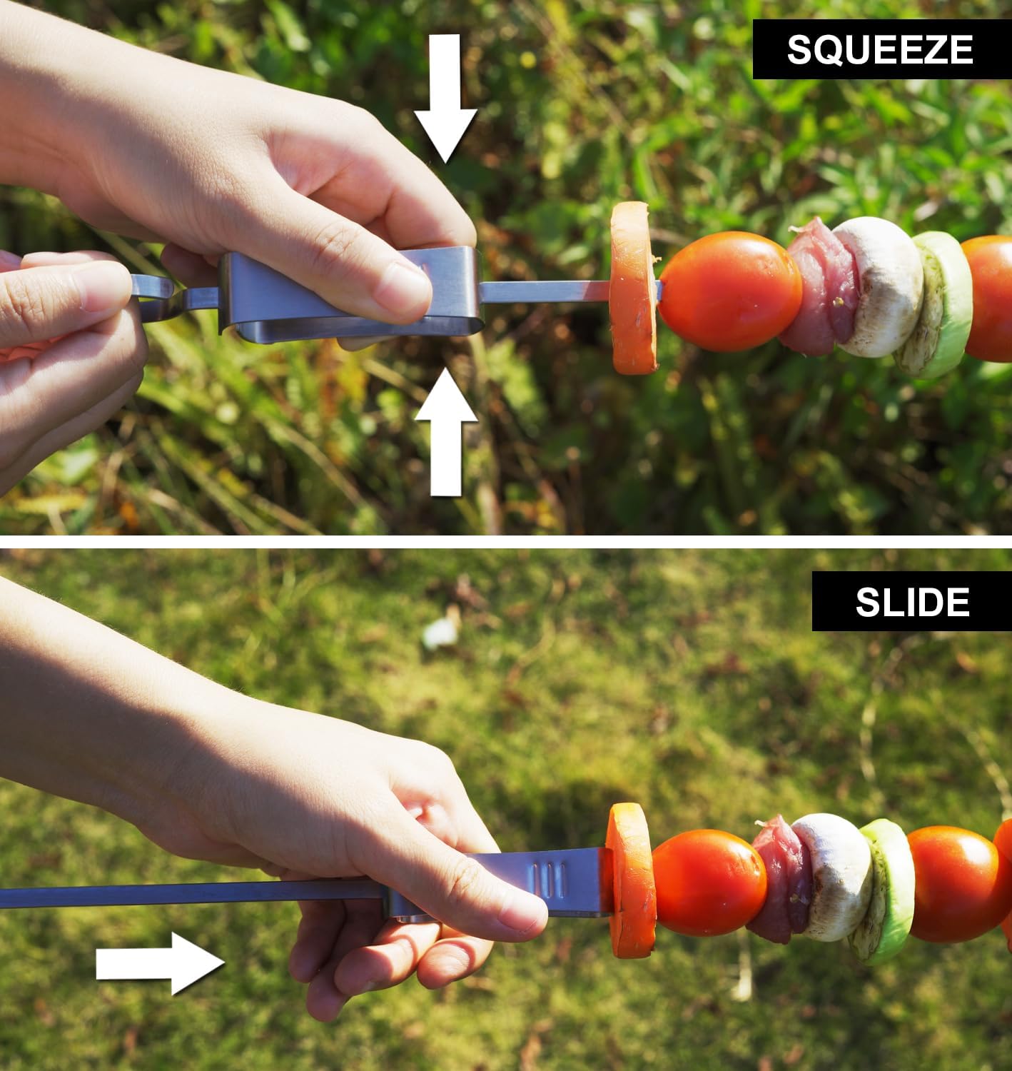 - UNIQUE PUSH BARS DESIGN: The push bar is conveniently designed to help you push the veggies and meat easily and without burning your fingers. With just one press and one push, the food can be easily removed from the skewers within a few seconds. Even children can operate it easily. Pay attention to preventing burns. Children must operate it under the supervision of adults.